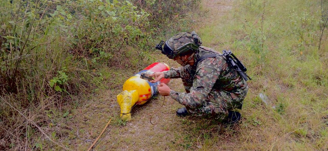 En las últimas horas, soldados del Batallón de Infantería N.º 26 Cacique Pigoanza, adscrito a la Novena Brigada, destruyeron de manera controlada un señuelo tipo cilindro que simulaba contener un artefacto explosivo, evitando un posible riesgo para la población civil y para los transportadores que recorren con frecuencia la ruta I-24.