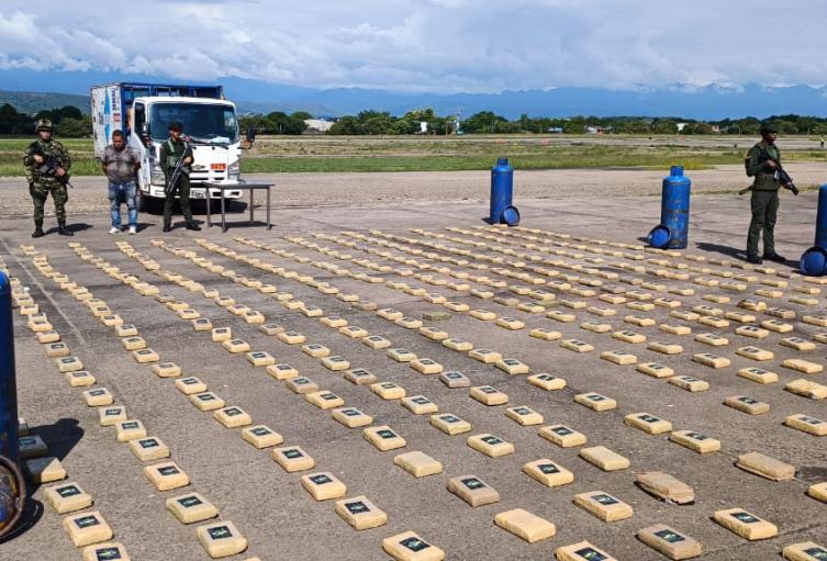 En un vehículo tipo NPR1, con logos de una empresa distribuidora de gas, empleando 8 cilindros de 100 libras, se acondicionaron los paquetes con la sustancia ilícita, que tendría como destino la ciudad de Neiva donde alcanzaría un valor comercial dosificado de $5 mil millones de pesos.