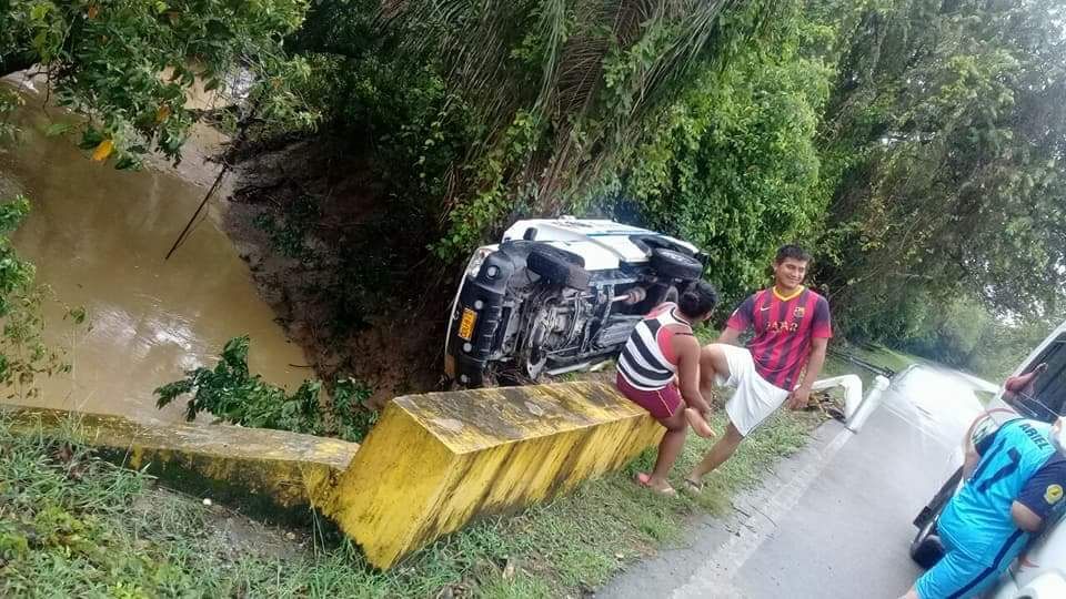 Sin embargo, mientras viajaban a una significativa velocidad con el pavimento húmedo, el conductor perdió el control del vehículo generando que se volcaran de forma lateral y quedaran a punto de caer a un afluente.
