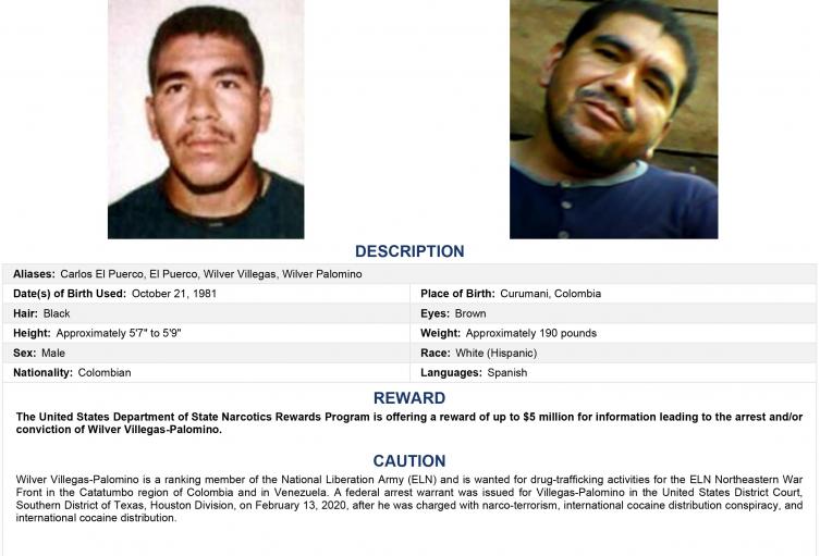 "Villegas-Palomino, alias 'Carlos El Puerco', pasó a ser uno de los diez fugitivos más buscados del FBI, por su supuesta participación en narcoterrorismo y actividades de tráfico de drogas", detalló en un comunicado la Oficina Federal de Investigación estadounidense.