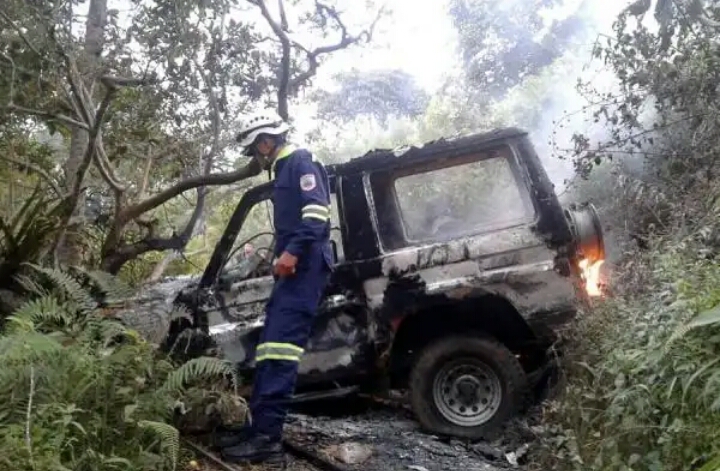 Producto del aparatoso accidente el campero Toyota Trooper de placas QAA-081 se incendió, dejando su chasis seriamente afectado por efecto de las llamas. Afortunadamente los dos ocupantes identificados como Deisy Granados y Gabriel Jaramillo lograron salir, pese a que estaban lesionados.