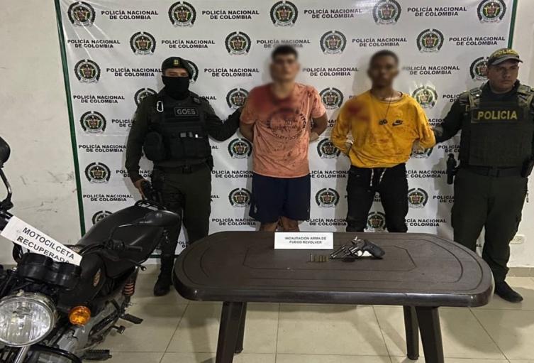 La Policía Tolima con su personal de los cuadrantes de la estación de Policía Armero Guayabal en conjunto con la seccional de tránsito y transporte, inteligencia y grupo de operaciones especiales Goes, en las últimas horas lograron la captura de dos sujetos, la inmovilización y recuperación de una motocicleta y la incautación de un arma de fuego con munición, según lo manifestado por él coronel Néstor Cepeda