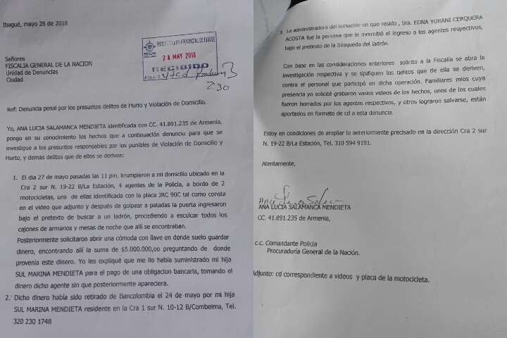 El caso se conoció a través de una entrevista concedida por la señora Ana Lucía Salamanca Mendieta, quien denunció que un uniformado de la Policía Metropolitana ingresó a su lugar de residencia ubicada en la carrera 2 Sur de nomenclatura 19 - 22 del barrio La Estación, con el pretexto de buscar un supuesto ladrón que allí había ingresado.