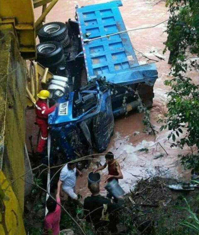 Luego del aparatoso accidente que se registró en la mañana de este viernes en el puente de acceso al corregimiento de Gualanday, donde el conductor de una volqueta doble troque perdió el control luego que el vehículo presentara una falla mecánica en el sistema de frenos, y terminara estrellándose contra las barandas de seguridad para aterrizar finalmente en el río.