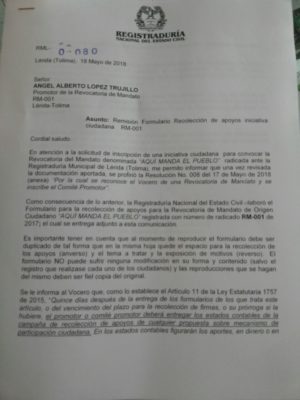 El documento con fecha del 18 de mayo y firmado por el registrador municipal de Lérida José Celestino Cabezas Quiroga, da vía libre a la iniciativa presentada por el comité promotor de revocatoria “Aquí manda el pueblo”, para iniciar la recolección de firmas que tiene como fin lograr una revocatoria al mandato de la alcaldesa Carolina Hurtado.