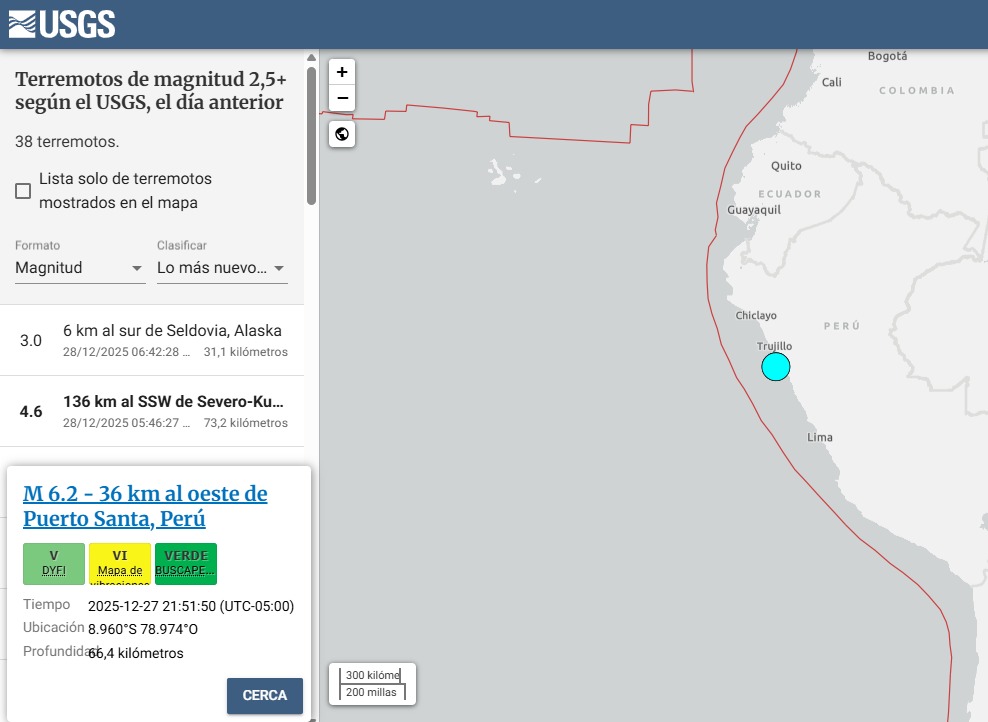 Un sismo de magnitud 6,0 se registró la noche del viernes 27 de diciembre frente a la costa de Áncash, con epicentro ubicado a 67 kilómetros al oeste de la ciudad de Chimbote, en la provincia del Santa, según información oficial difundida por el Instituto Geofísico del Perú (IGP).