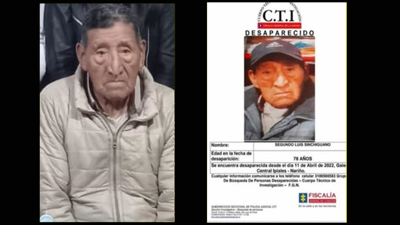 El día de su desaparición en Ipiales el señor Sinchiguano Toapanta vestía chaqueta beige, pantalón de tela color plomo oscuro y una gorra azul oscura. Como señal particular, dice su hijo Wilson, el abuelo solo tienen algunos dientes en la parte inferior.