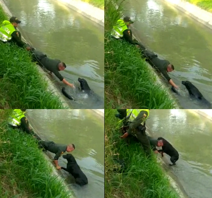 Fue así que rápidamente integrantes del cuadrante 18 del CAI Variante, en cabeza de los patrulleros Julio Pana y Jhonatan Táutiva, se dieron a la tarea de acercar al animal, hasta lograr sujetarlo y finalmente rescatarlo de la muerte, teniendo en cuenta que estaba ya agotado por la lucha constante contra la corriente.