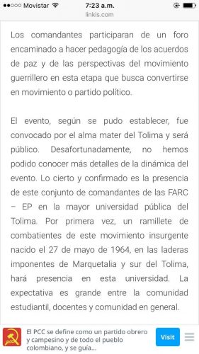 El portal http://www.pacocol.org informa que “Los comandantes participarán de un foro encaminado a hacer pedagogía de los acuerdos de paz y de las perspectivas del movimiento guerrillero en esta etapa que busca convertirse en movimiento o partido político”.