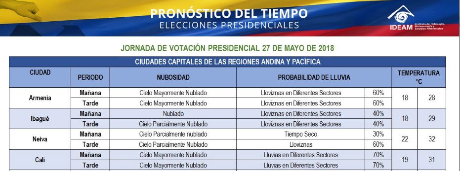 Es así como se dio a conocer el primer informe de los que se actualizarán cada 12 horas para informar a los colombianos sobre las condicione climáticas en las principales ciudades del país y así salir preparados a ejercer su derecho al voto.
