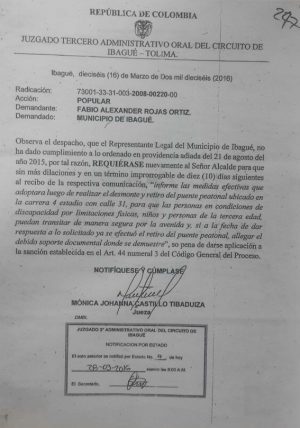 “Informe las medidas efectivas que adoptara luego de realizar el desmonte y retiro del puente peatonal ubicado en la carrera 4 estadio con calle 31, para que las personas en condiciones de discapacidad por limitaciones físicas, niños y personas de la tercera edad, puedan transitar de manera segura por la avenida” expone el documento.