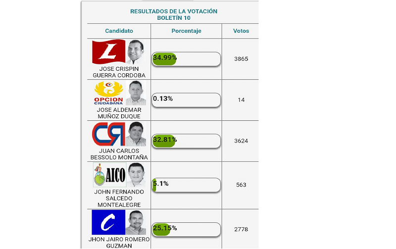 En la información entregada por la Registraduría, las votaciones en esta localidad quedaron de la siguiente forma: Juan Carlos Bessolo 3.624, Jhon Jairo Romero 2.778, Jhon Fernando Salcedo 563, José Aldemar Muñoz Duque 14, votos en blanco 94, votos nulos 85 y votos sin marcar 25.