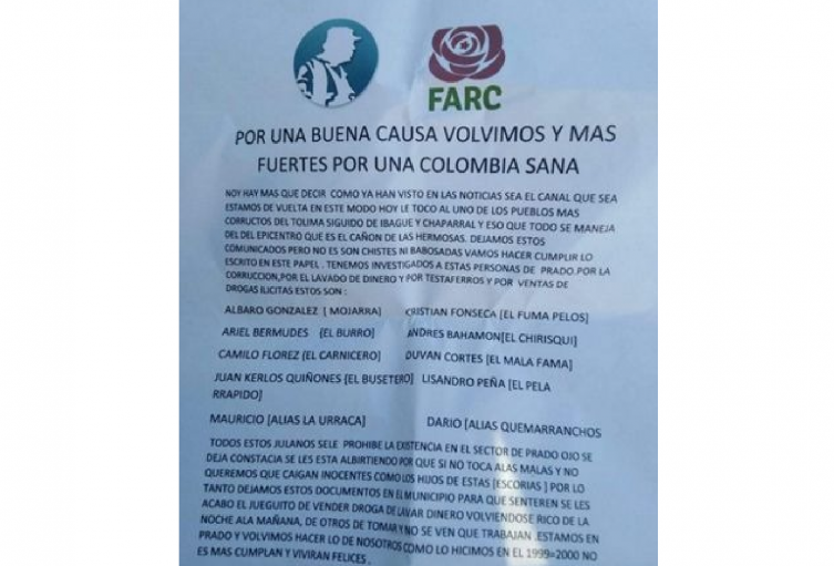 Según el documento, el supuesto grupo guerrillero les prohíbe la presencia esas personas en este municipio al cual califican como el tercero más corrupto del Tolima después de Ibagué y Chaparral, acusando la gran mayoría de los mencionados de ser expendedores de alucinógenos.
